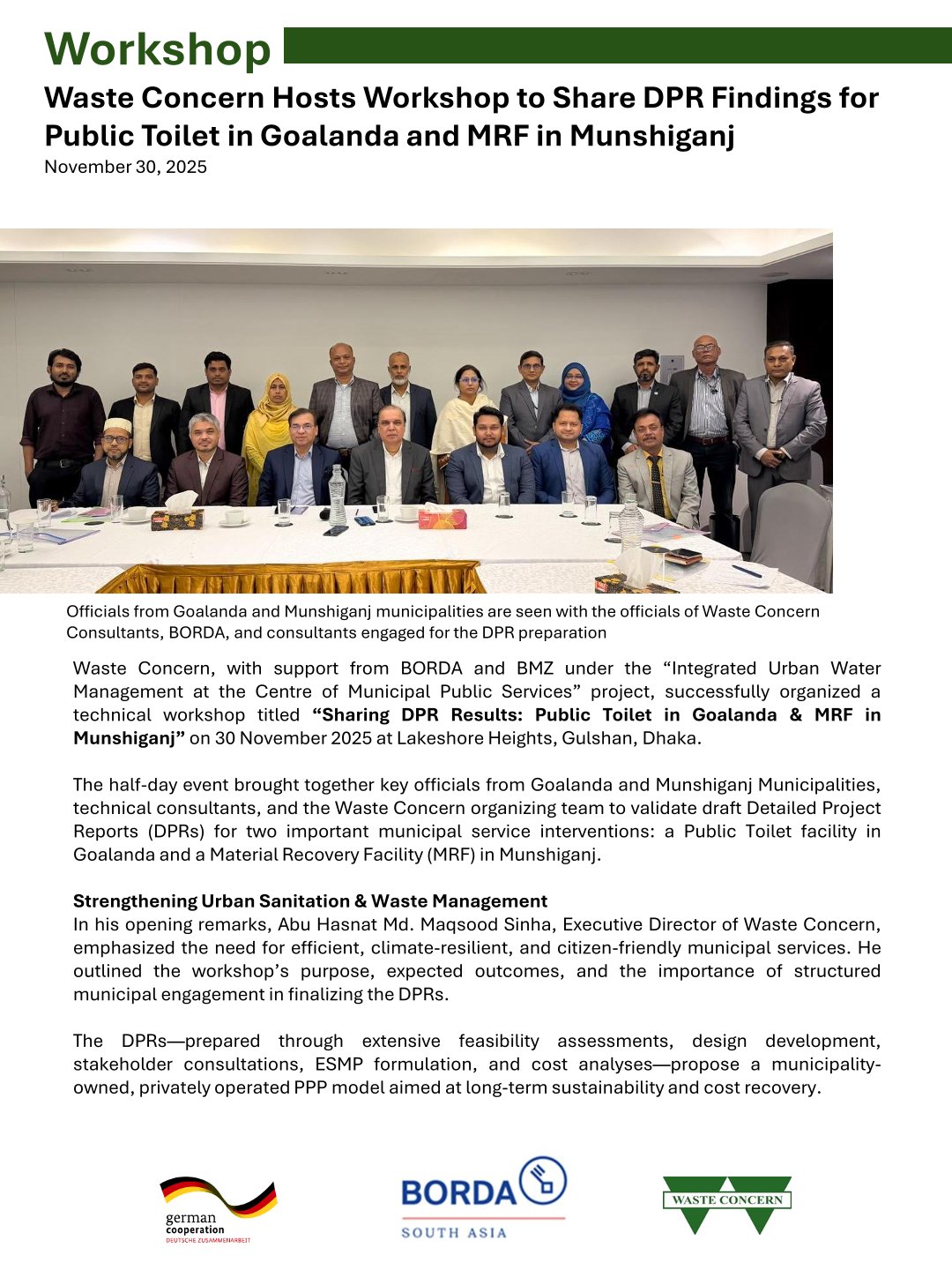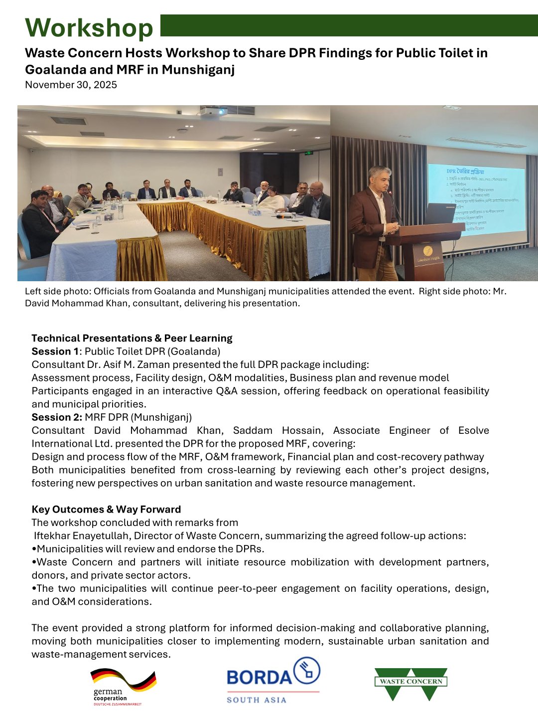 Waste Concern Hosts Workshop to Share DPR Findings for Public Toilet in Goalanda and MRF in Munshiganj
